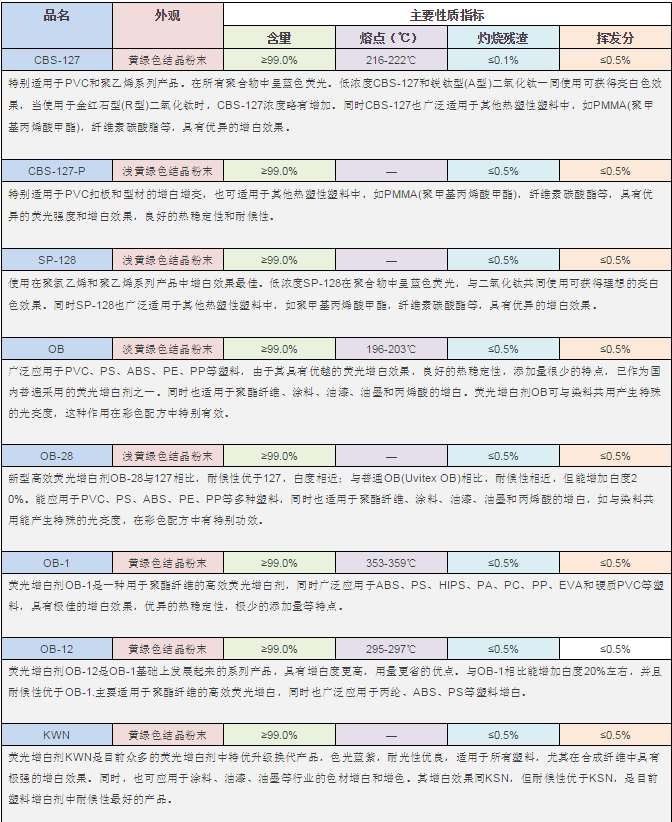 熒光增白劑可以吸收不可見的紫外光(波長范圍約為60—380nm),轉(zhuǎn)換為波長較長的藍光或紫色的可見光,因而可以補償基質(zhì)中不想要的微黃色,同時反射出比原來入射的波長在400—600nm范圍的更多的可見光,從而使制品顯得更白、更亮、更鮮艷。