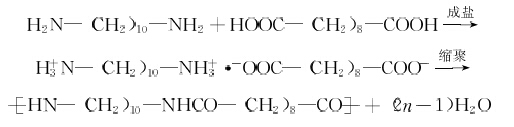 鹽再經(jīng)縮聚反應(yīng)制得PA1010。縮聚反應(yīng)有連續(xù)縮聚和間歇縮聚兩種工藝,目前大多數(shù)生產(chǎn)廠采用釜式間歇縮聚T 藝,其特點是設(shè)備簡單,操作方便,聚合體的粘度易于控制。反應(yīng)式如下: