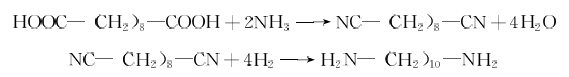癸二胺的制法:將熔融的癸二酸與氨氣以氣液相進行氨化脫水反應(yīng),生成癸二腈。反應(yīng)需在高溫下進行,最高溫度為340V。癸二腈以乙醇為溶劑,雷尼鎳為催化劑,氫氧化鉀為助催化劑,在80?110°C 反應(yīng)溫度和2. 5MPa 壓力下,進行加氫反應(yīng)而制得癸二胺。反應(yīng)式如下: